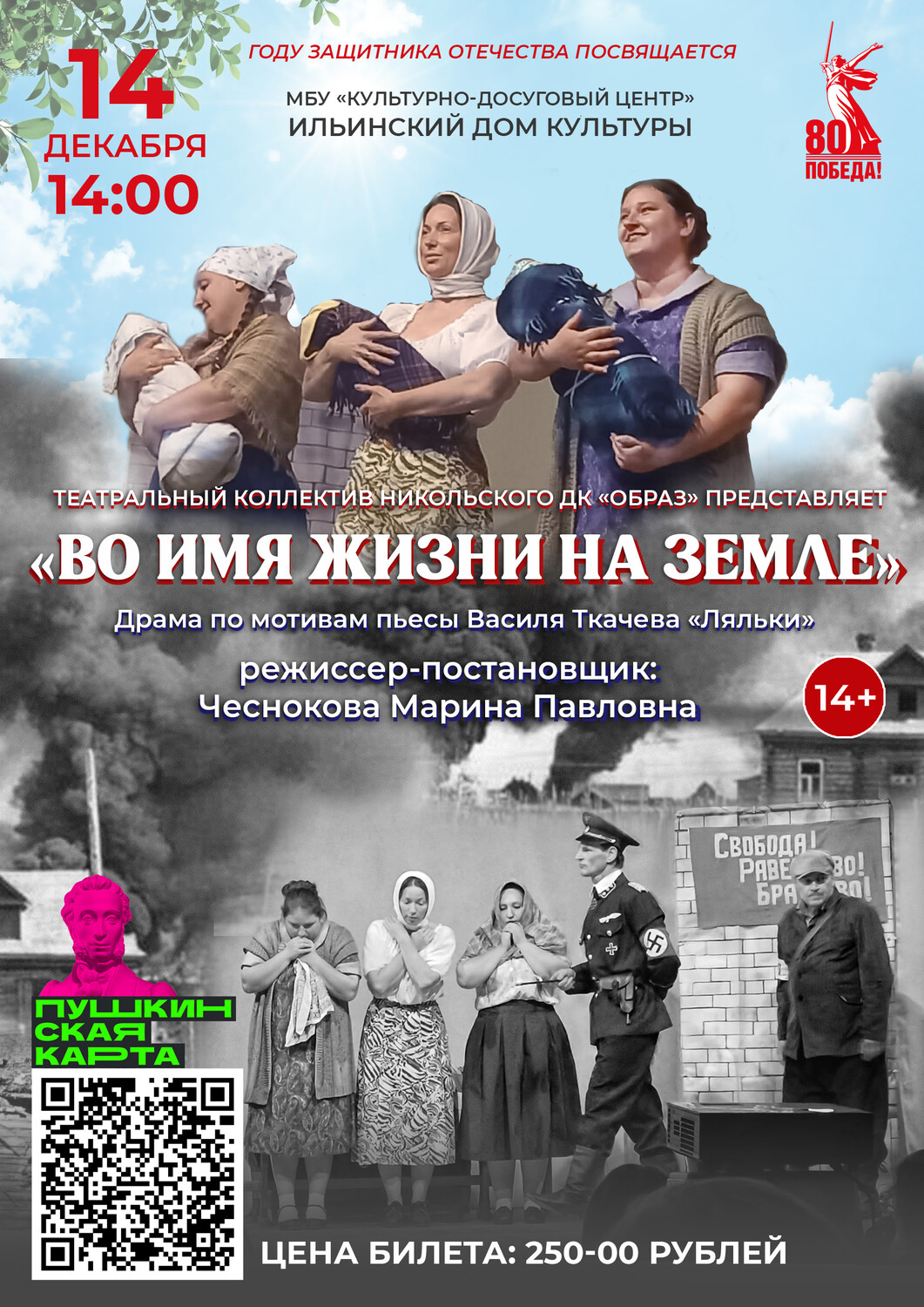 Никольский театральный коллектив "Образ" и режиссер Никольского дома культуры Марина Павловна Чеснокова приглашают жителей и гостей Ильинска в зрительный зал дома культуры на показ спектакля "Во имя жизни на земле". Спектакль о тяжелой жизни в оккупации поставлен на основе пьесы Василия Ткачева "Ляльки".